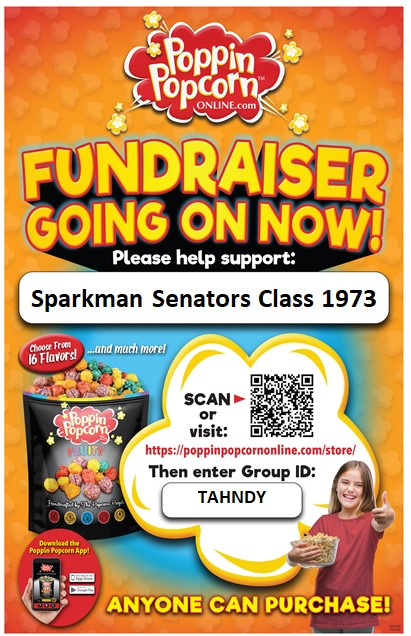 * - Kenneth Vaughn, Kathi Hill, Doug Hendrix and Alan Ray each donated $100 (Yea!). The GoFundMe Fees ($1.89 per $100) were added back to the total by another Sparkman1973 classmate to eliminate coin change and realize the full donations. Poppin Popcorn sales were made by three sellers (Jean Glover, Doug Hendrix, and Alan Ray). A special thanks for all donations received.